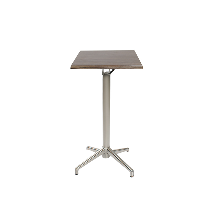 -Mesa con cubierta circular o cuadrada y pedestal abatible de aluminio pulido para exterior.