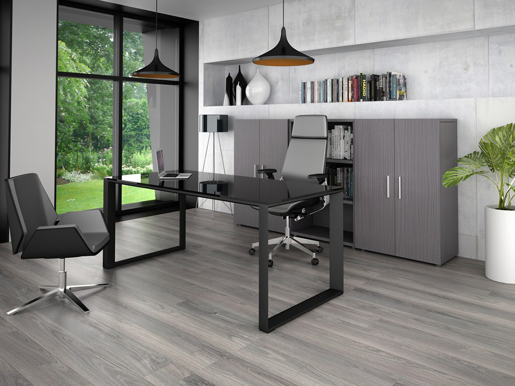 Conjunto ejecutivo SQ cubierta en cristal, estructura metálica color negro, juego de libreros medios con puertas y abierto al centro.